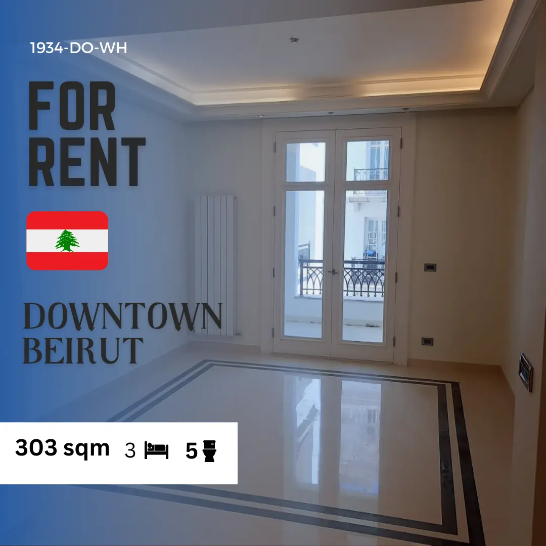 303 sqm Apartment for rent in Downtown , Beirut 3 Master Bedrooms | 5 Bathrooms 1 Dining room | 2 Living room 1 Kitchen | 1 Maid room + bathroom Heating installation / AC Central 5 Balconies | 24/7 electricity 2 Parking Price : 4,000 $ per month1934-DO-WHشقة 303 م 2 للإيجار في وسط المدينة ، بيروت 3
