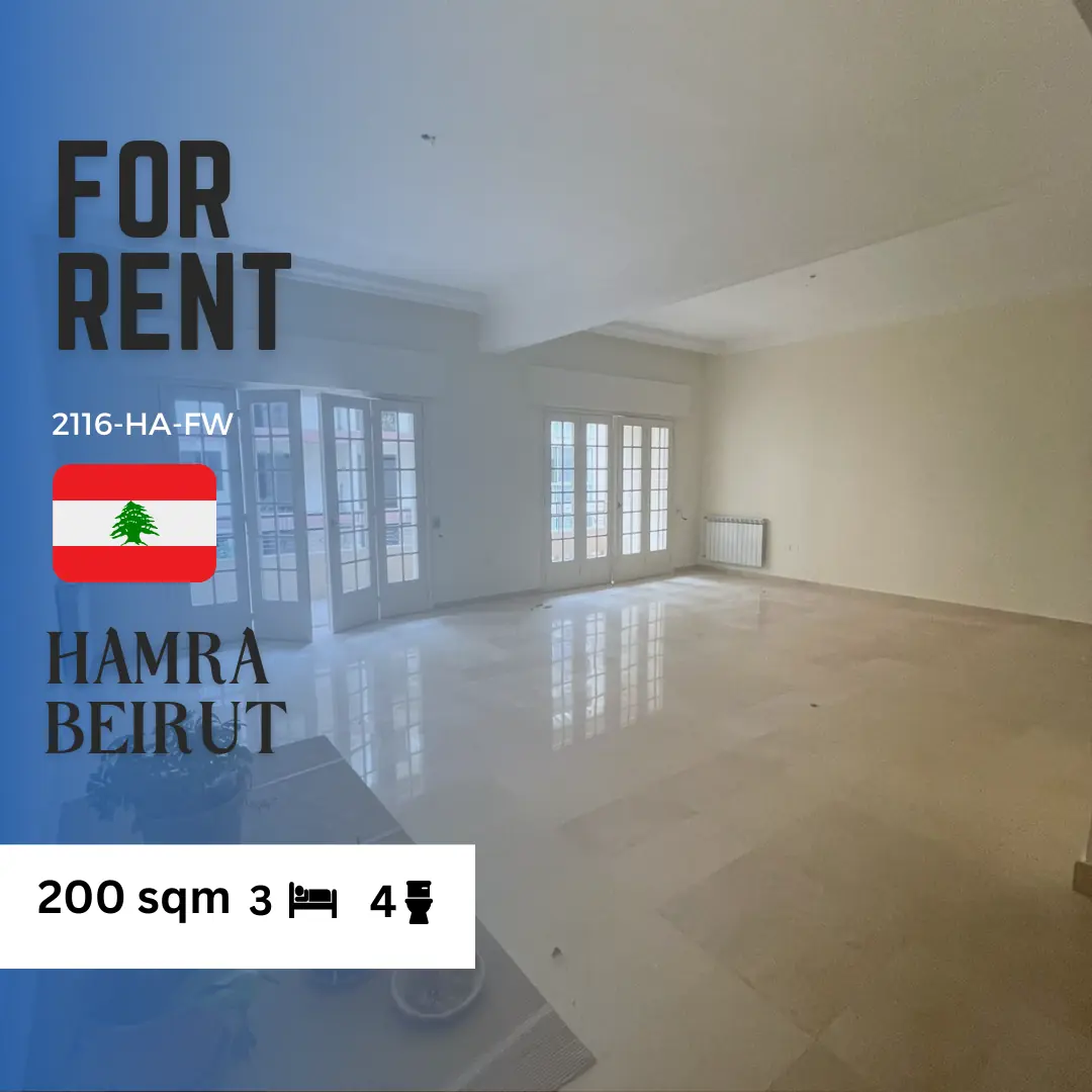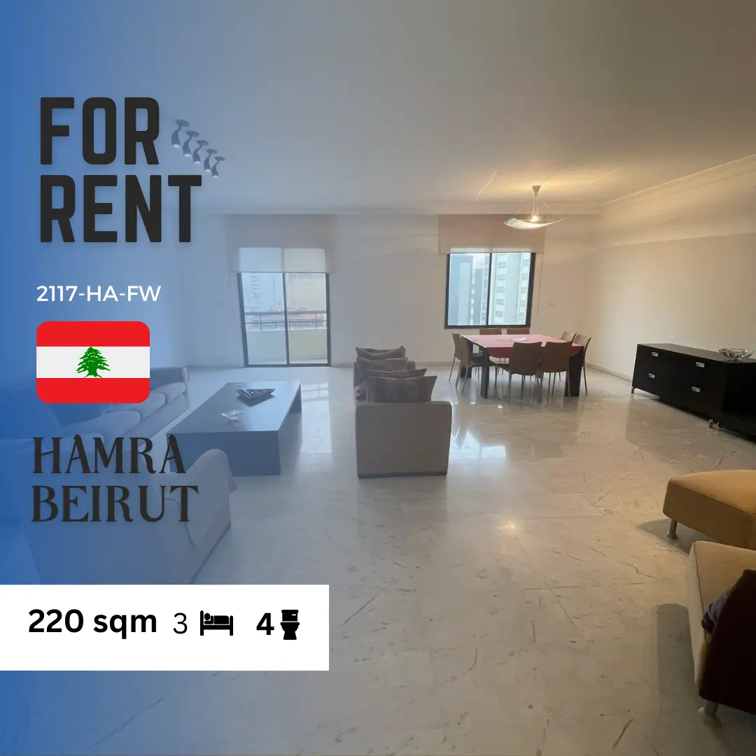 220 sqm Apartment for rent in Hamra floor 10 1 master bedroom | 2 regular bedrooms 3 bathrooms | Kitchen Maid room + bathroom | Dining room Living room | Ac central Sea view | 4 Balconies 2 elevators | 1 parking Price : 1,700$ per month2117-HA-FW